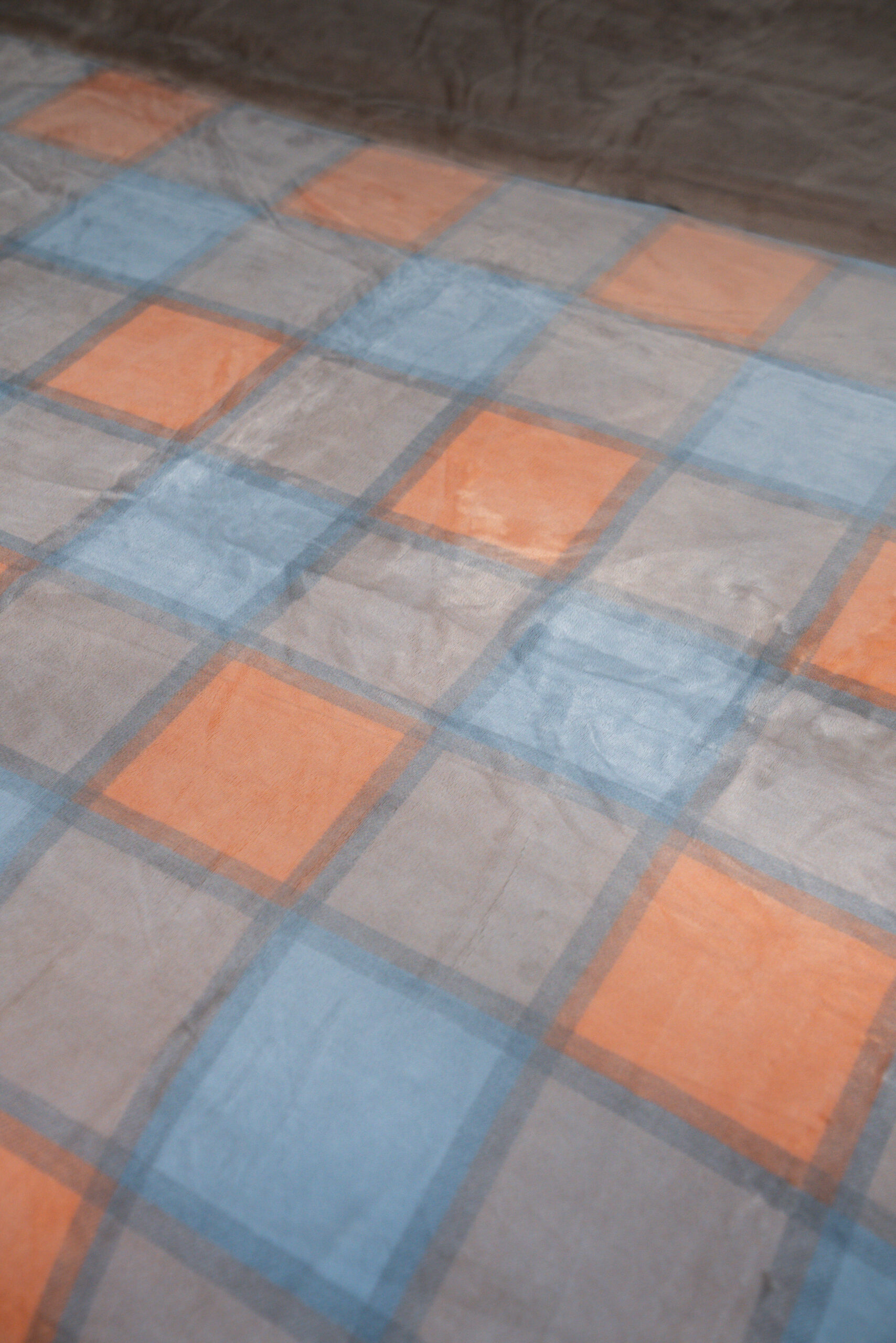 Draps à carreaux modernes, mélange harmonieux d’orange, bleu clair et beige pour un style chaleureux et tendance.