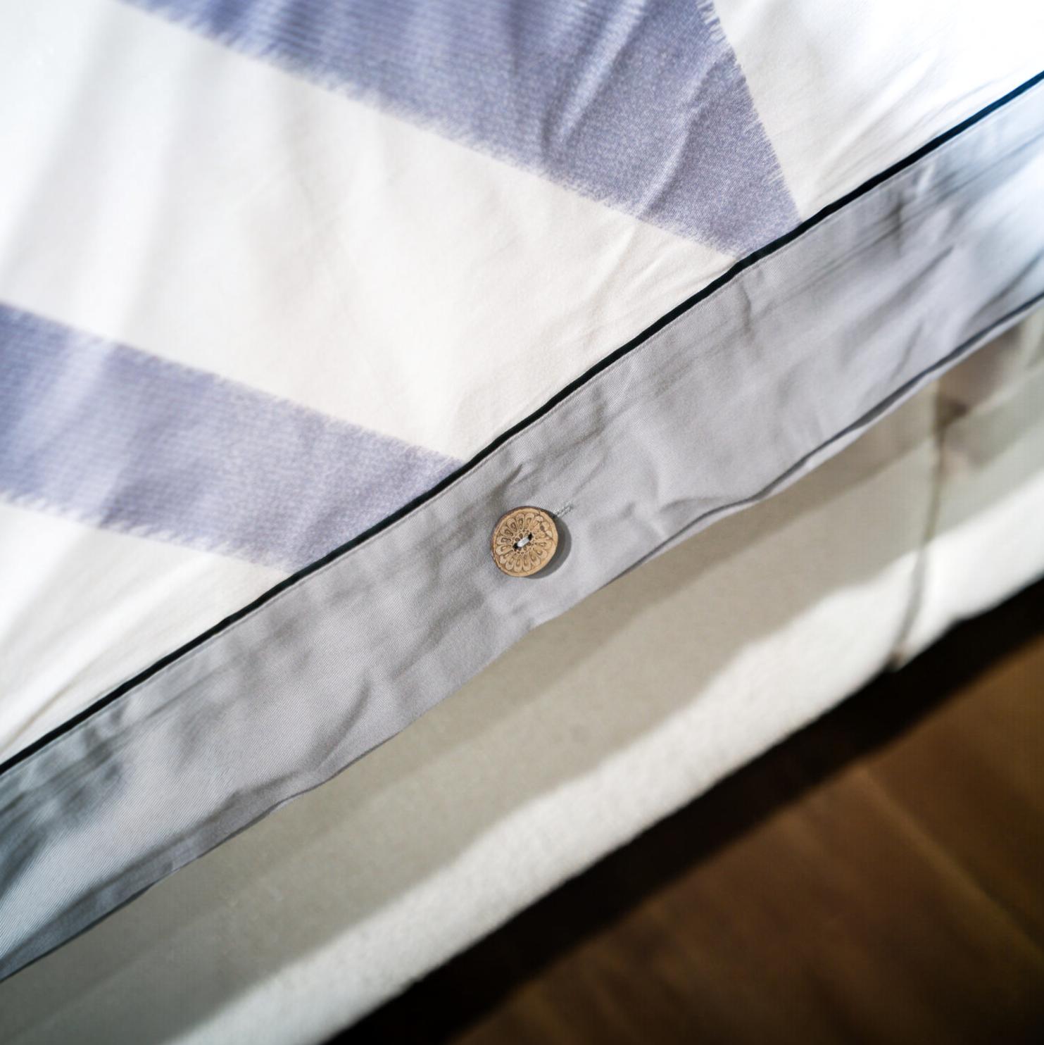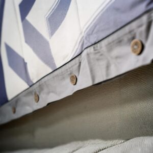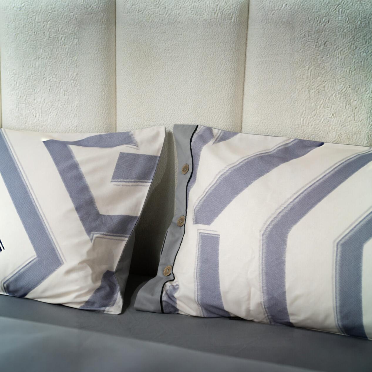 Graphique sans être rigide, cette housse de lit joue avec des formes structurées et des nuances gris minéral pour composer une ambiance contemporaine et équilibrée. Le motif apporte du caractère tout en conservant une grande douceur visuelle, idéale pour une chambre élégante et lumineuse.