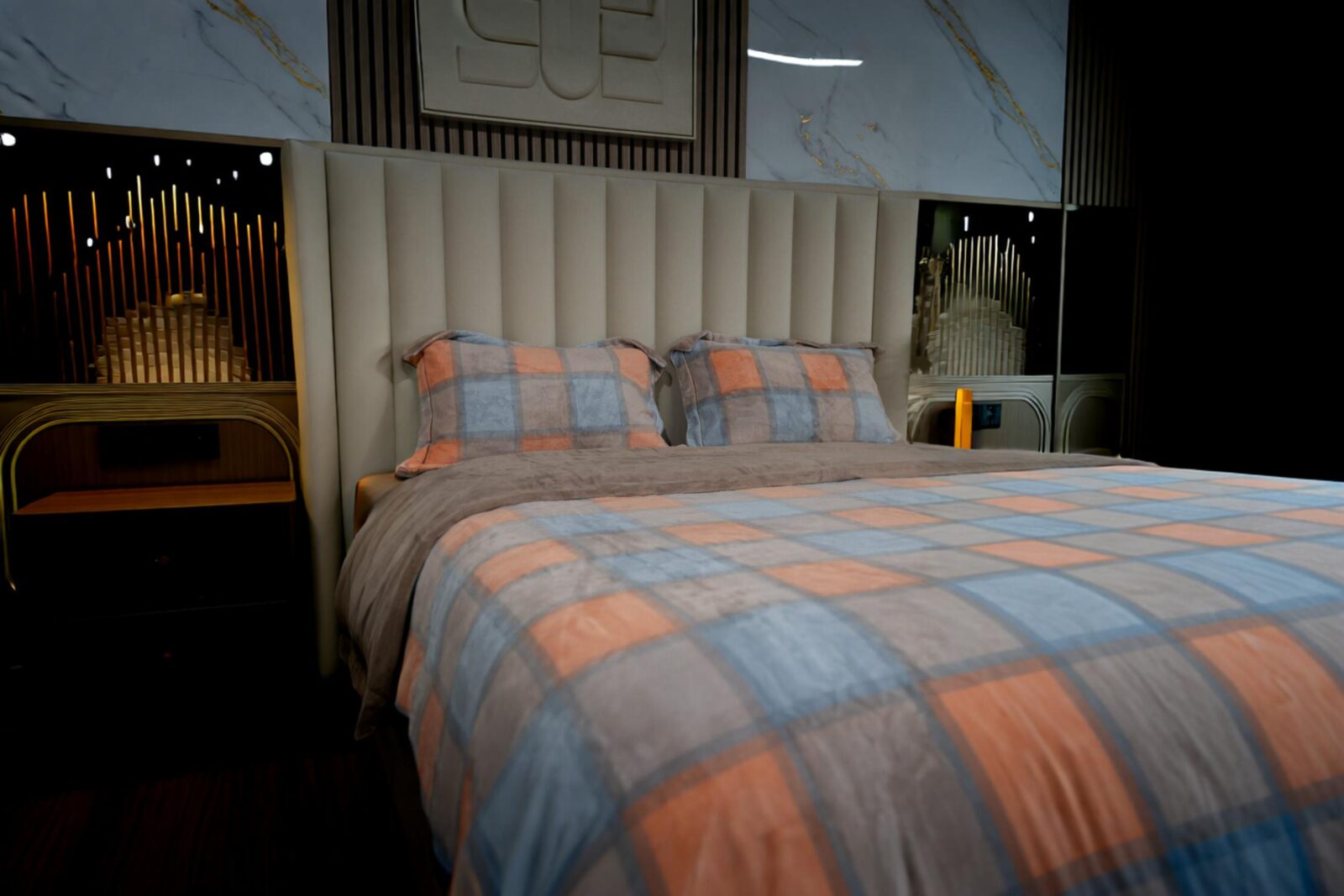Avec son jeu de carreaux modernes et ses couleurs chaleureuses, cette housse de lit apporte une touche graphique tout en restant douce et accueillante. L’association du bleu apaisant, du beige naturel et des touches terracotta crée une ambiance à la fois contemporaine et confortable.