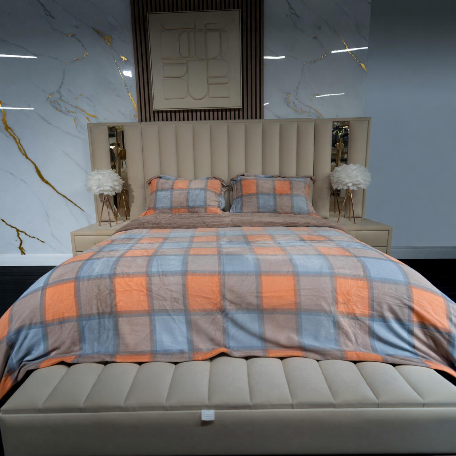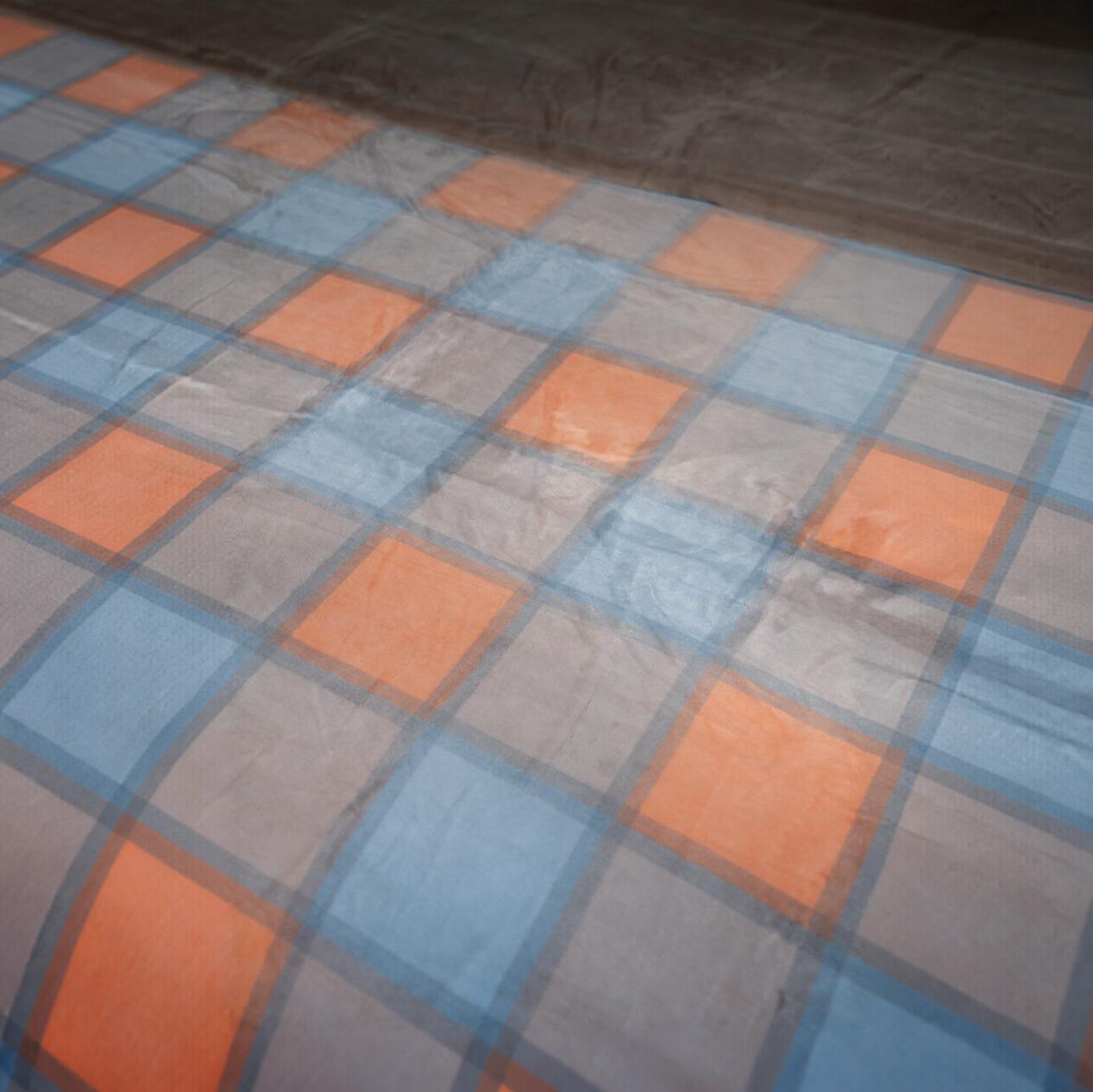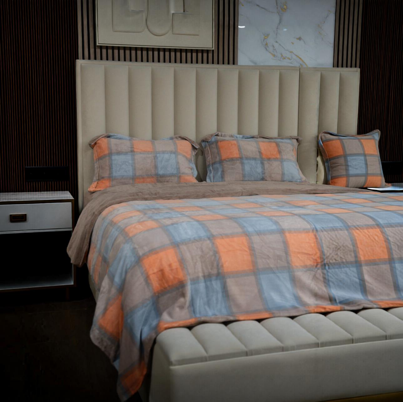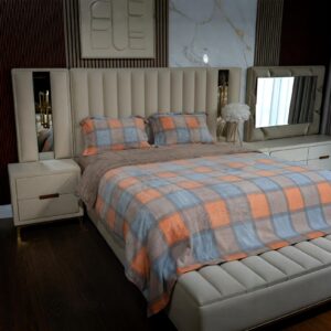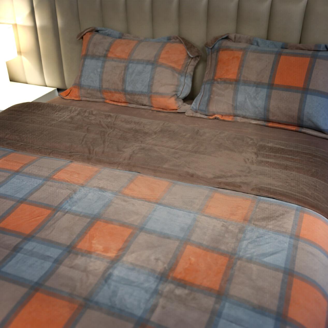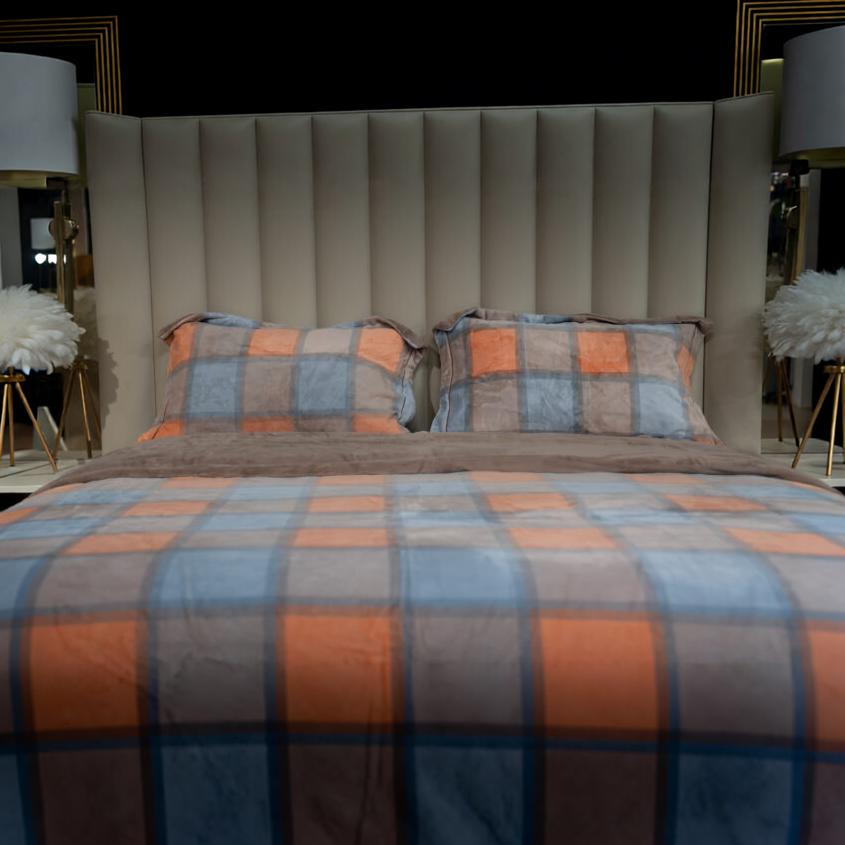 Avec son jeu de carreaux modernes et ses couleurs chaleureuses, cette housse de lit apporte une touche graphique tout en restant douce et accueillante. L’association du bleu apaisant, du beige naturel et des touches terracotta crée une ambiance à la fois contemporaine et confortable.