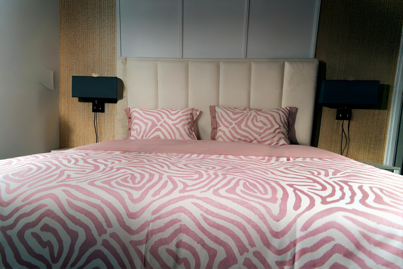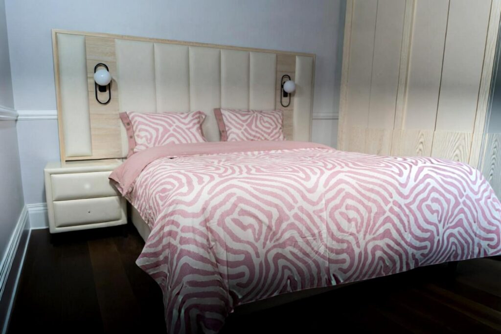 Cette parure de lit aux motifs organiques et aux tons rose poudré transforme la chambre en un espace doux et contemporain. Son design fluide apporte une sensation de calme et de raffinement, tandis que la matière agréable au toucher invite au confort absolu.